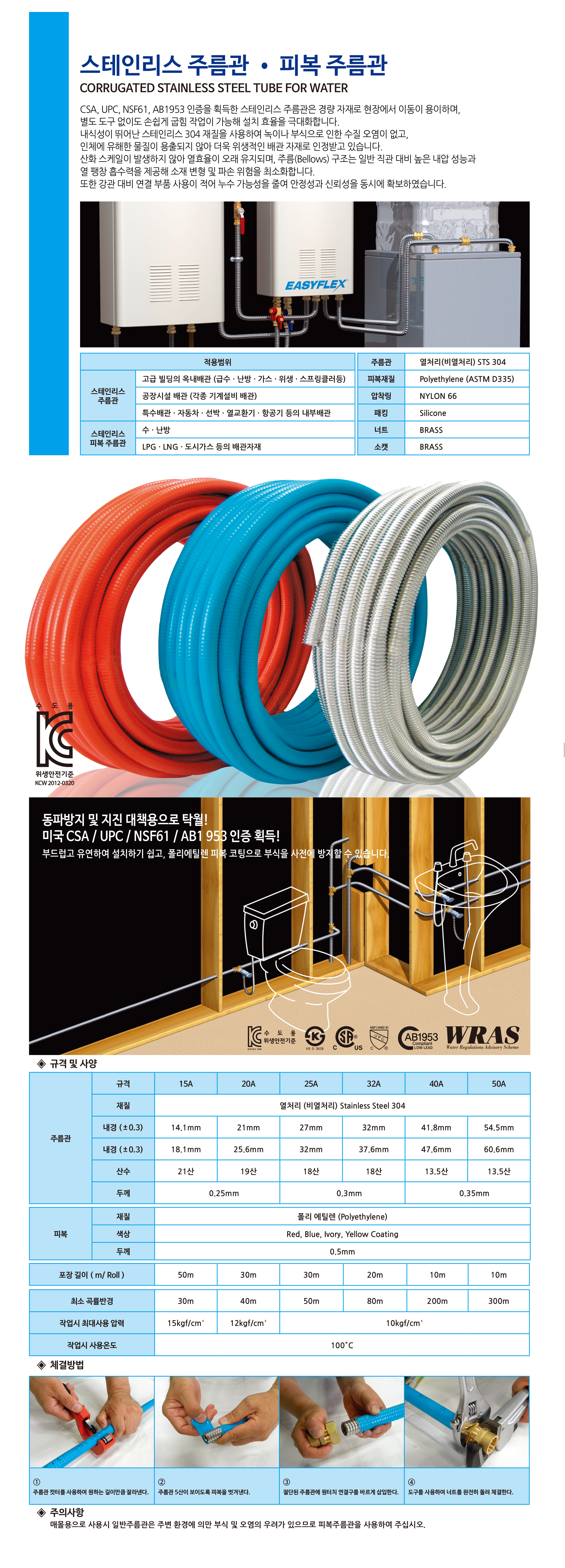 산화 스케일이 형성되지 않으므로 열효율이 지속적으로 높고, 주름 형상은 타 금속 직관보다 내압이 커서 열팽창시 관의 팽창 흡수율을 높이기 때문에 소재 변형 및 파괴 등 하자의 위험을 최소화합니다. 무산화광휘소둔 열처리 과정을 통해 재질의 강도를 높였으며, 강관보다 연결 부품을 사용하는 빈도가 낮아 연결부위로 인한 누수 가능성이 낮습니다. 주름관을 좁은 공간에서도 공구 없이 자유롭게 굽힐 수 있어 설치작업이 쉬우며, 금속직관 대비 공사비를 대폭 절감 및 시공기간 단축 효과가 있습니다.